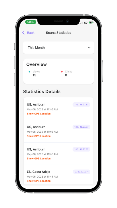 When someone scans your pet's tag, they'll open your pet's profile and you will get an in app notification on your phone with the GPS location and IP address.